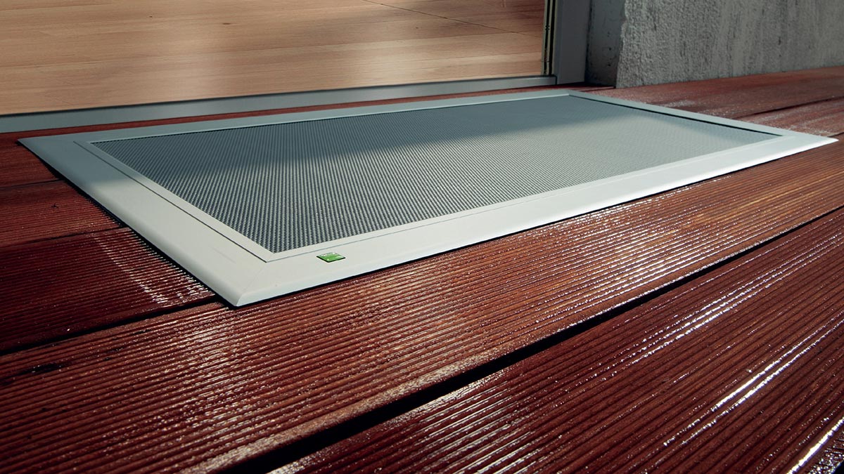 erfal bietet als Standardfarben ohne Aufpreis silbergrau eloxiert, Graualuminium Glimmer und dunkelgrau Glimmer. Der dunkelgraue Rahmen ist besonders rutschhemmend, kratzfest und überzeugt mit einer geringen Verschmutzungsanfälligkeit.