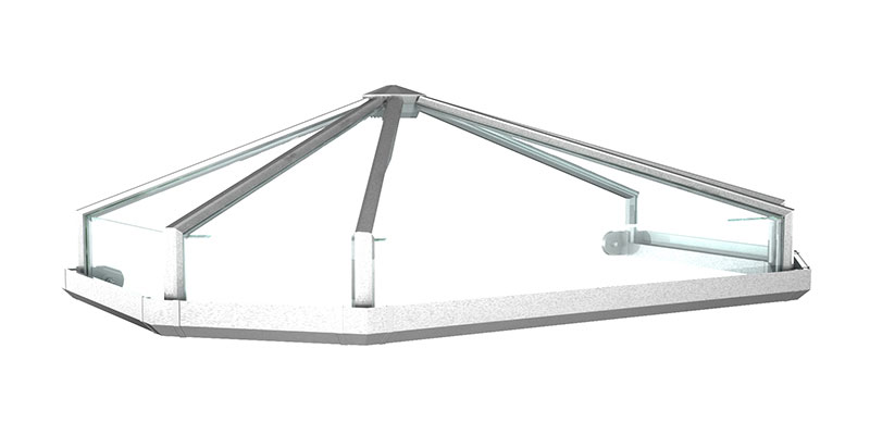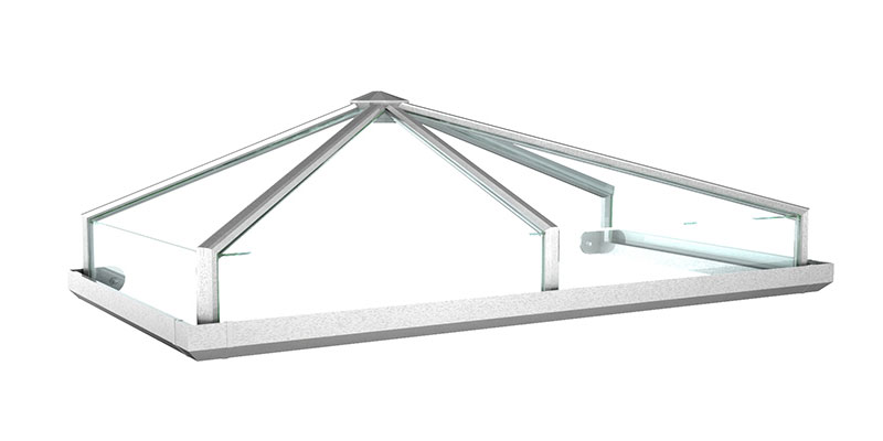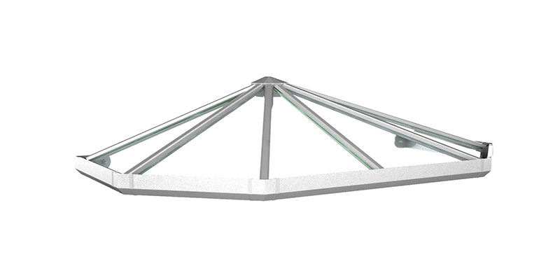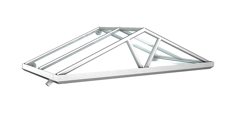 Durch die pyramidenförmig gekantete Aluhaube gelangt das Wasser in das umlaufende Rahmen-Rinneprofil des flachen Vordachs.