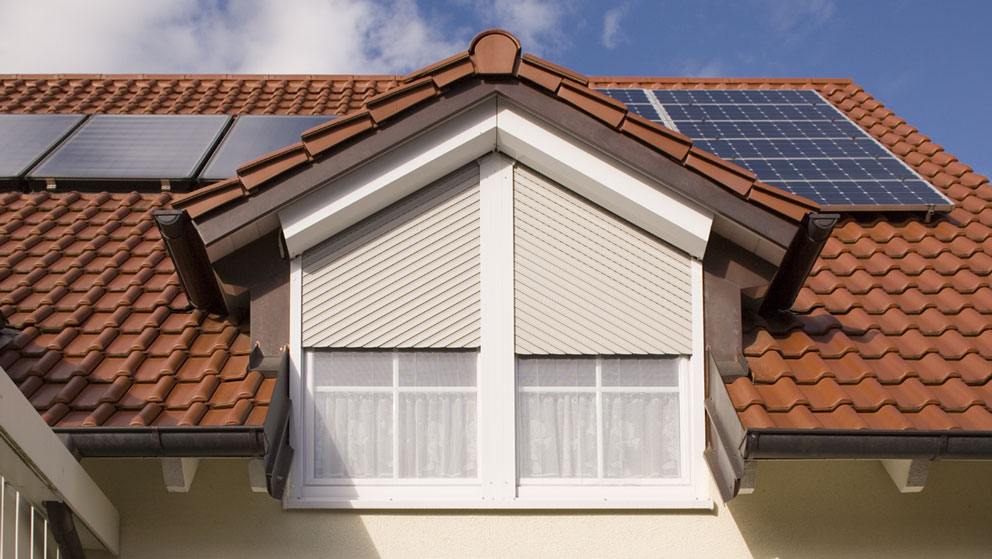 Für asymmetrische Fenster von 0,5° bis 45° eignen sich die Schrägrollladen von ALUKON. Sie passen sich harmonisch in das Gesamtbild der Fassade ein und lassen sich wie normale Rollladen öffnen und schließen. Schrägrollladen können im Neubau wie auch bei Modernisierungen eingesetzt werden und eigenen sich besonder gut für Giebelfenster.