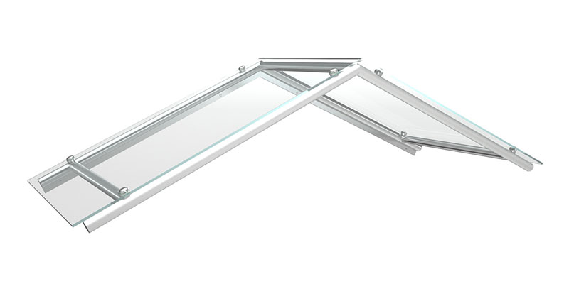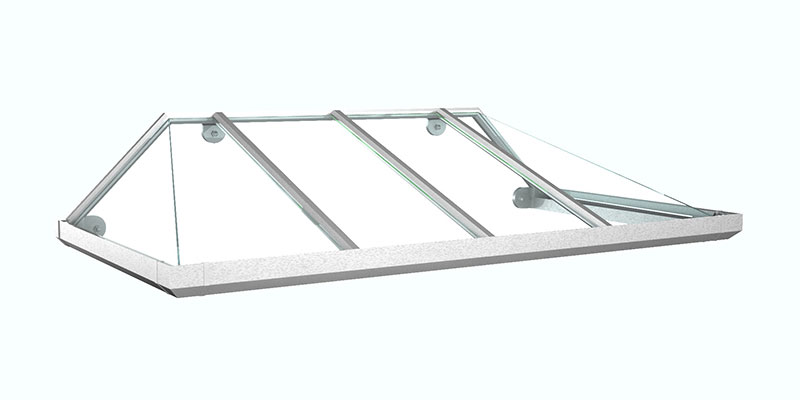 Durch die pyramidenförmig gekantete Aluhaube gelangt das Wasser in das umlaufende Rahmen-Rinneprofil des flachen Vordachs.